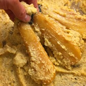 当店のからすみは京都の西京白味噌に漬け込み、仕上げます。塩でしっかりと水分を抜き、そこへ西京白味噌の風味を戻していきます。