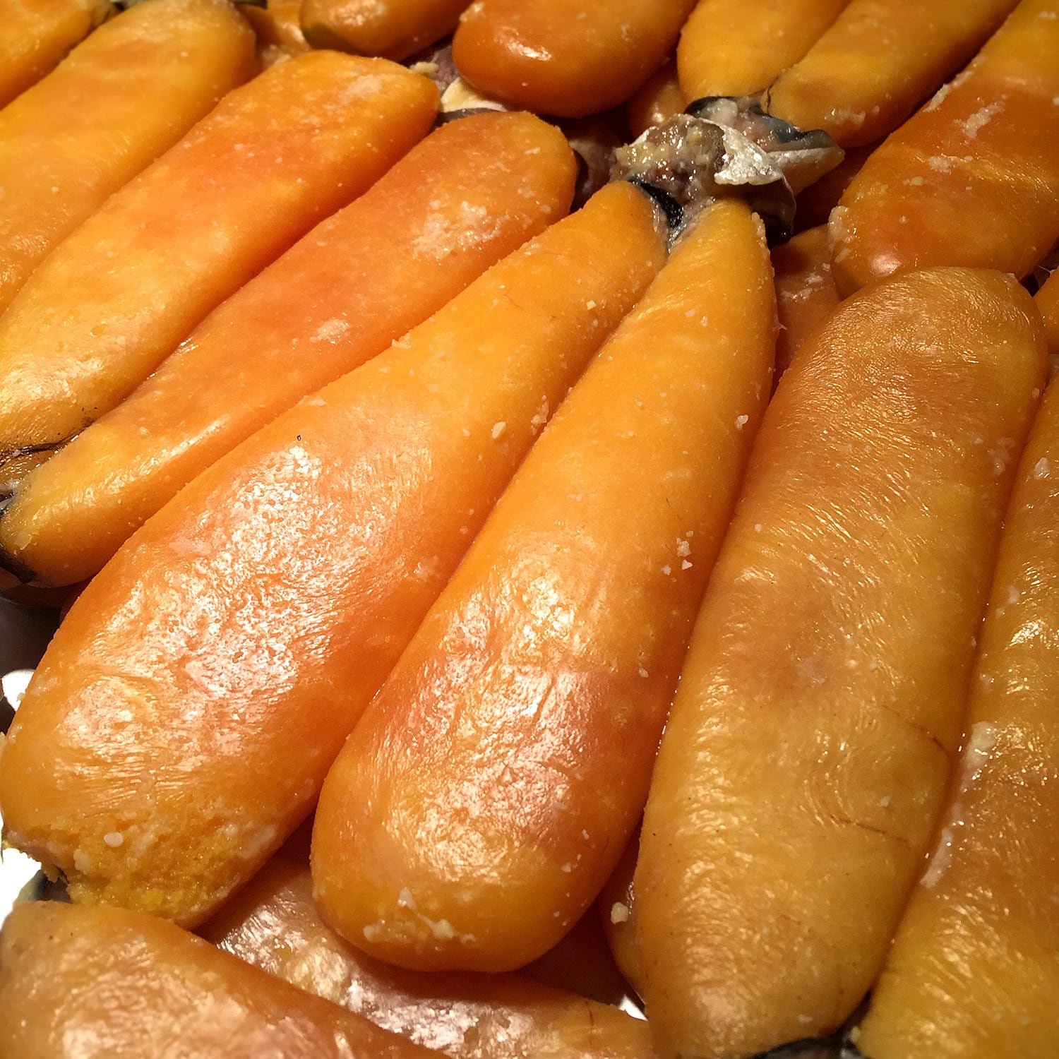 当店のからすみは京都の西京白味噌に漬け込み、仕上げます。塩でしっかりと水分を抜き、そこへ西京白味噌の風味を戻していきます。