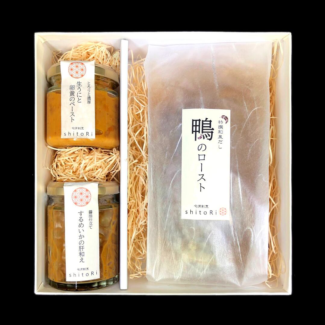 「 鴨のロースト 」「するめいかの肝和え」&「生うにと卵黄のペースト」の詰め合わせ ※化粧箱付